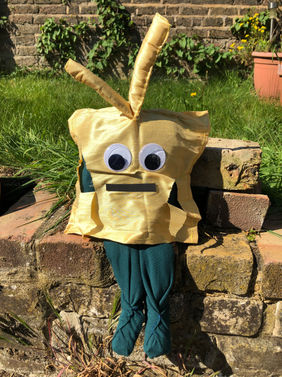 In addition to the book, I created a physical version of Peanut and Onion. I used pillow stuffing, off cut pieces of fabric and old t-shirts that I sewed together to create the final outcome. I purchased googly eyes from the pound shop and used super glue to attach them to the faces of the puppets.